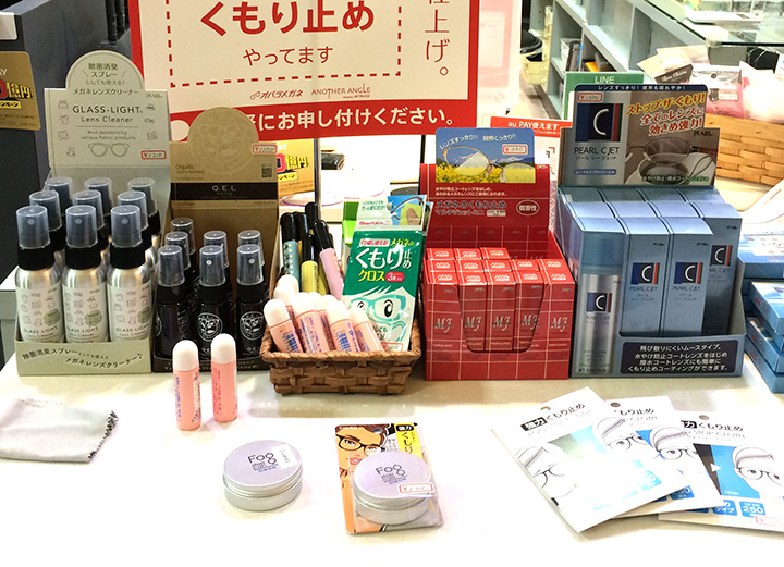 上の写真はお店のレジ前にある「くもり止めコーナー」。お店にもよりますが、常時10種類ほど揃えております。これだけあるとどれがいいのか迷ってしまいますよね。