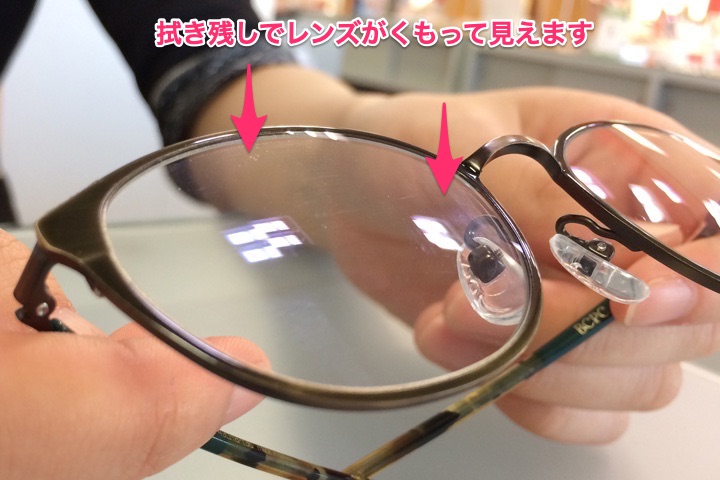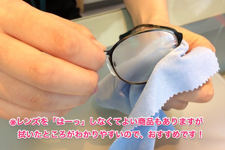 商品により、拭く前にレンズに息を吹きかけて拭くものとそうでないものがありますが、拭いた跡がわかりやすいので、お店ではどちらの商品も一度くもらせてから拭くことをおすすめしています。