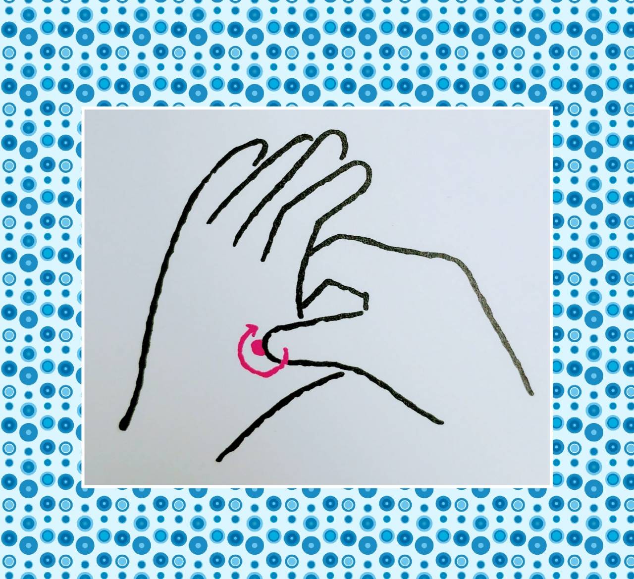 合谷のツボを反対の手の親指を使って円を描くようにぐりぐりと押します。両手それぞれ20〜30回押します。