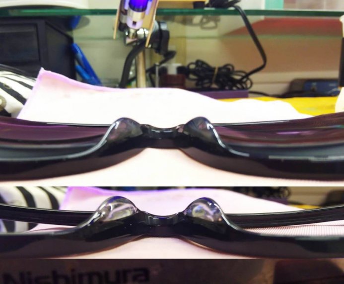 樹脂を塗り重ねて鼻に当たる面積を増やす鼻盛りという加工(上が加工前下が加工後)