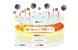 レンズの撥水コートと反射防止コートの間にAg+(銀イオン)成分を含む抗菌コートを挟むことで、レンズの表面に抗菌性能を持たせることを実現しました。抗菌フレームは材質に銅イオンを配合しております。
