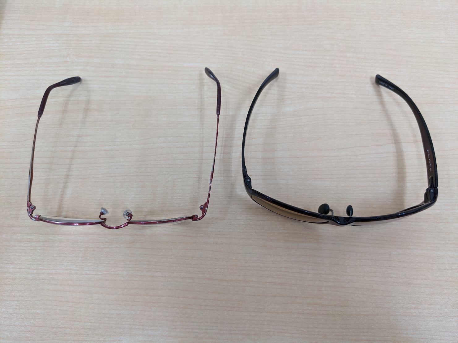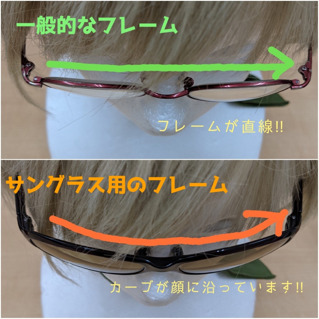 写真のように、こんな感じでカーブがあるのがメガネフレームとサングラスフレームの大きな違いです。