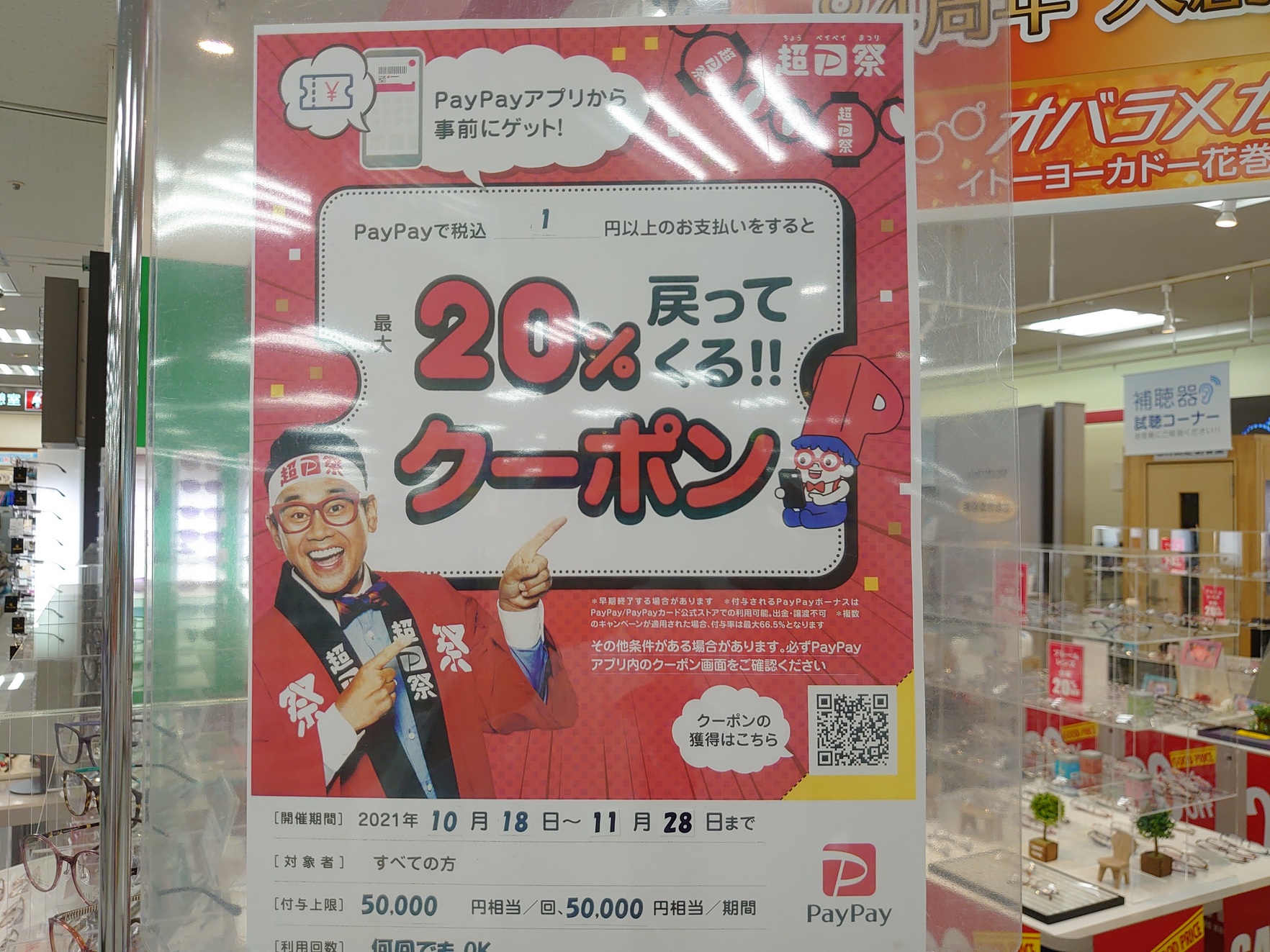 2021年10月18日(月)~11月28日(日)までの期間利用できるペイペイ20%還元クーポン発行中。
