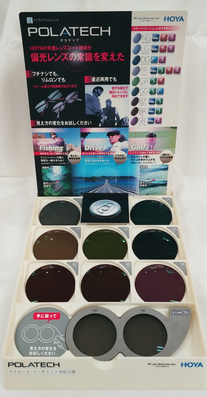 偏光レンズは、上記カラーの他にもバリエーションがあります。色の濃淡も豊富です。また、レンズに度数を入れることが可能ですので、詳しくは、スタッフまでお気軽にご相談ください。