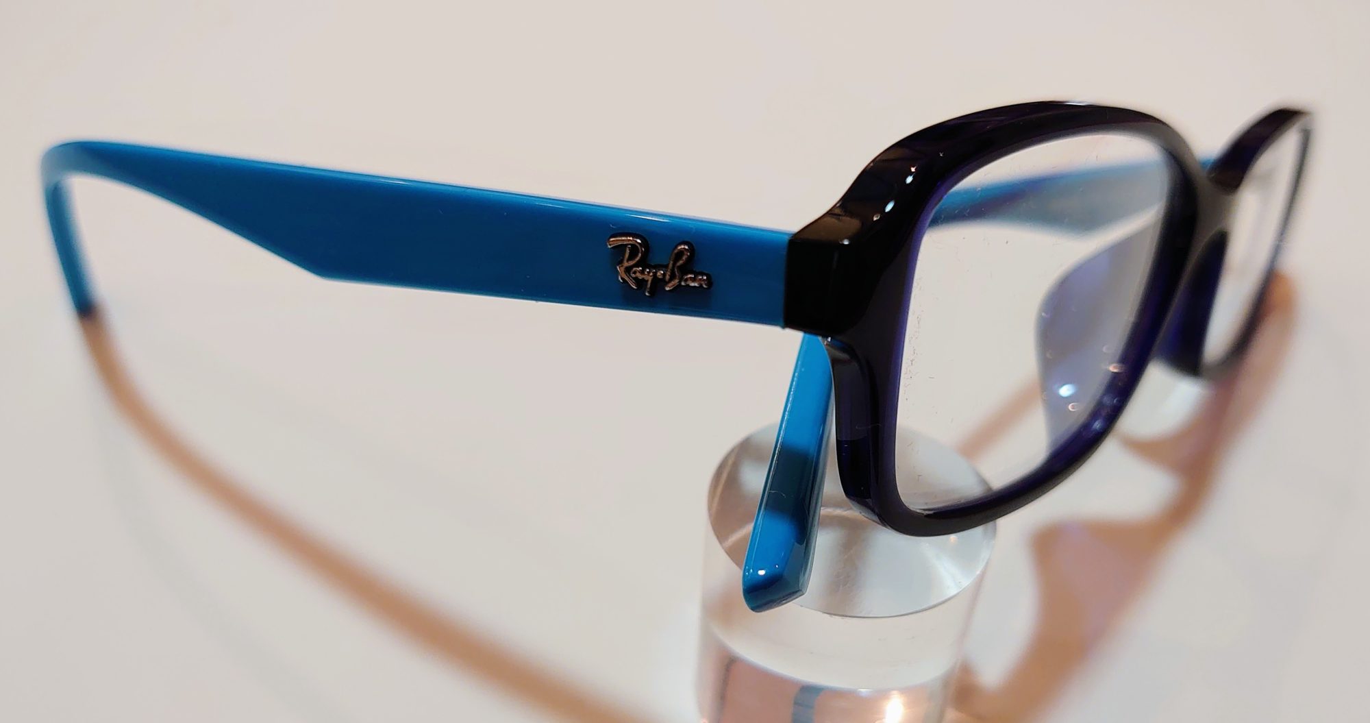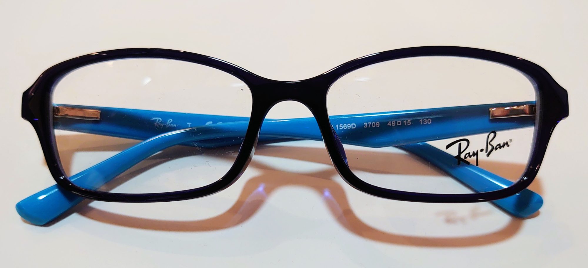 深い青色のフロントに、パステルカラーの明るいテンプルとのコントラストが鮮やかなメガネフレームです。
