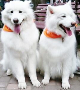 散策中、大きくて真っ白なモフモフわんちゃん達と遭遇。