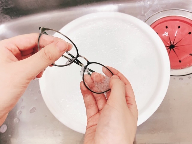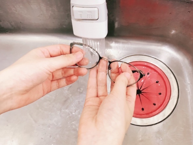①まずメガネを軽くすすいで表面の汚れを落とします。